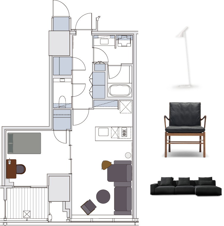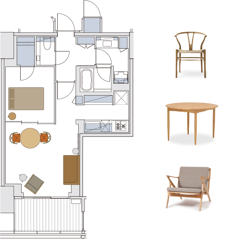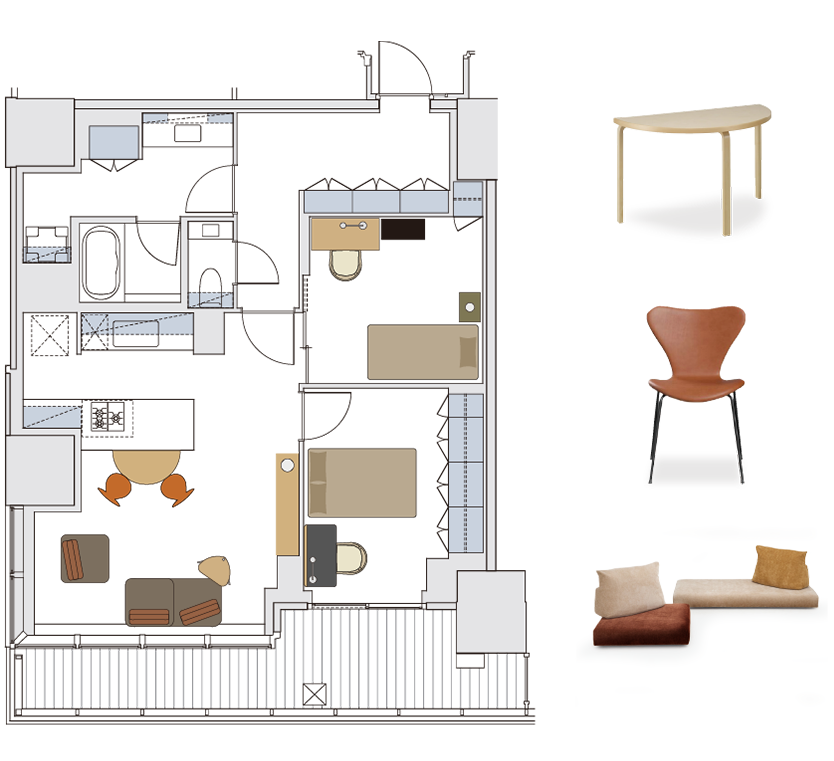 各お部屋には、お住まいの間、くつろぎとつながりを生み出すソファやテーブル、長く愛されてきた名作の家具、
