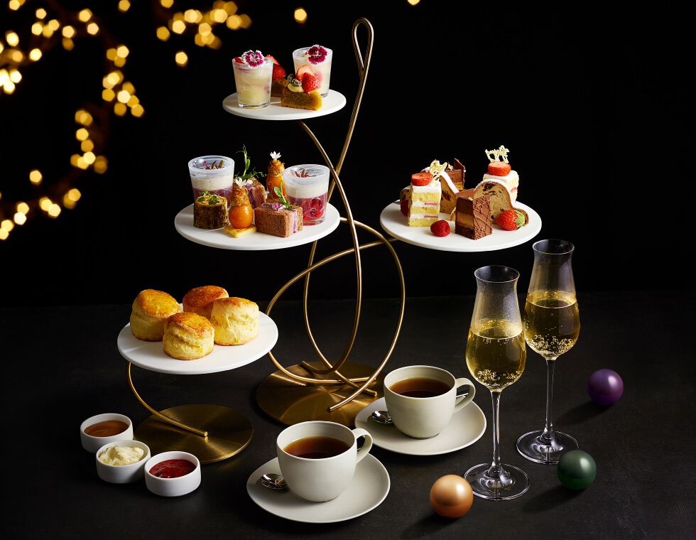 クリスマスケーキのような華やかなスイーツと、ローストビーフを使ったセイボリーなど、この時期ならではの彩りと食材で作られた12月限定アフタヌーンティー