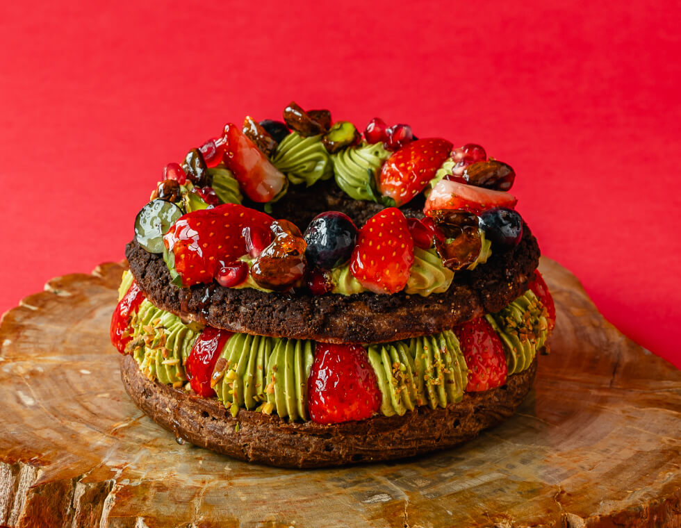 たっぷりとピスタチオを使用した2種類のクリームと苺を中心とした数種類の鮮やかなフルーツをふんだんに使用したクリスマス限定のシューケーキです。