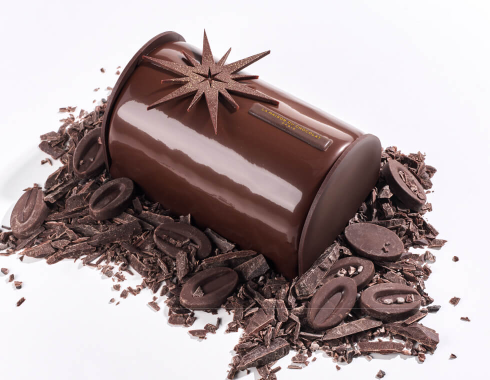 濃厚なダークチョコレートのムースに、なめらかなクレムーショコラオレ、2種のビスキュイ、クレムーキャラメル、クランブルショコラをともに仕立てた、ショコラの魅力をご堪能いただけるクラシックなビュッシュ。