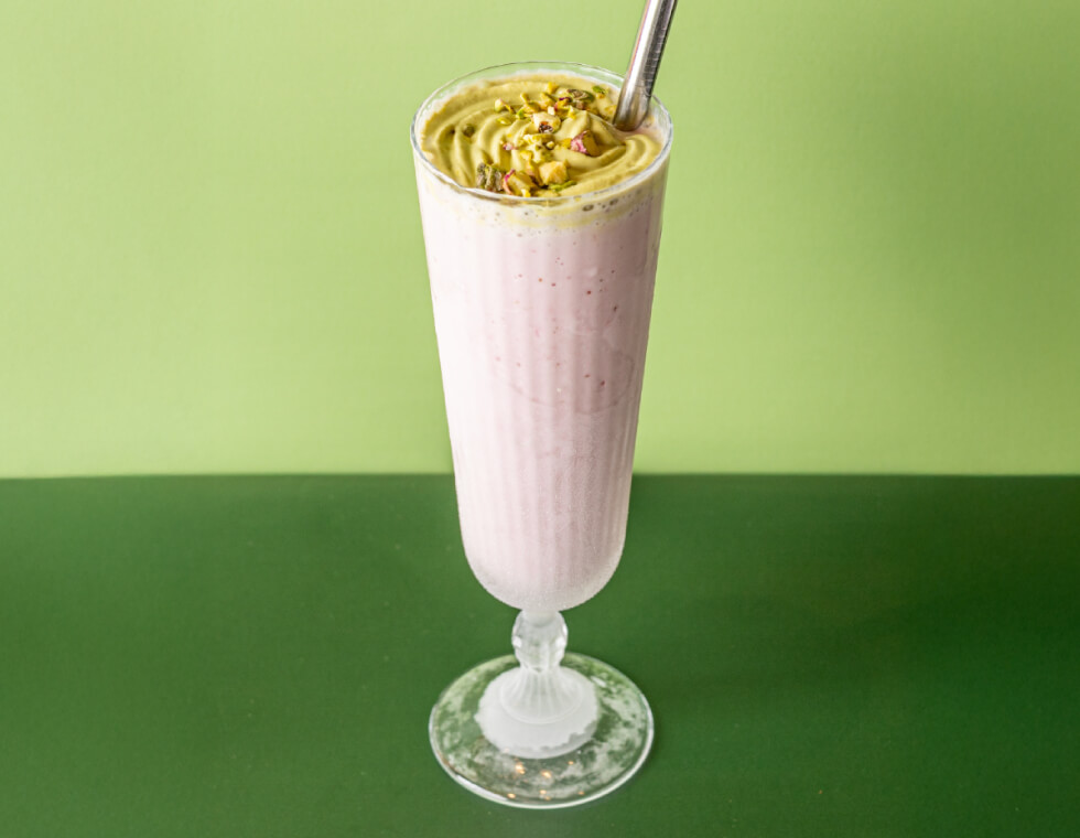 ストロベリーを使用した甘酸っぱく濃厚なシェイクにピスタチオの香り豊かなクリームをトッピング。