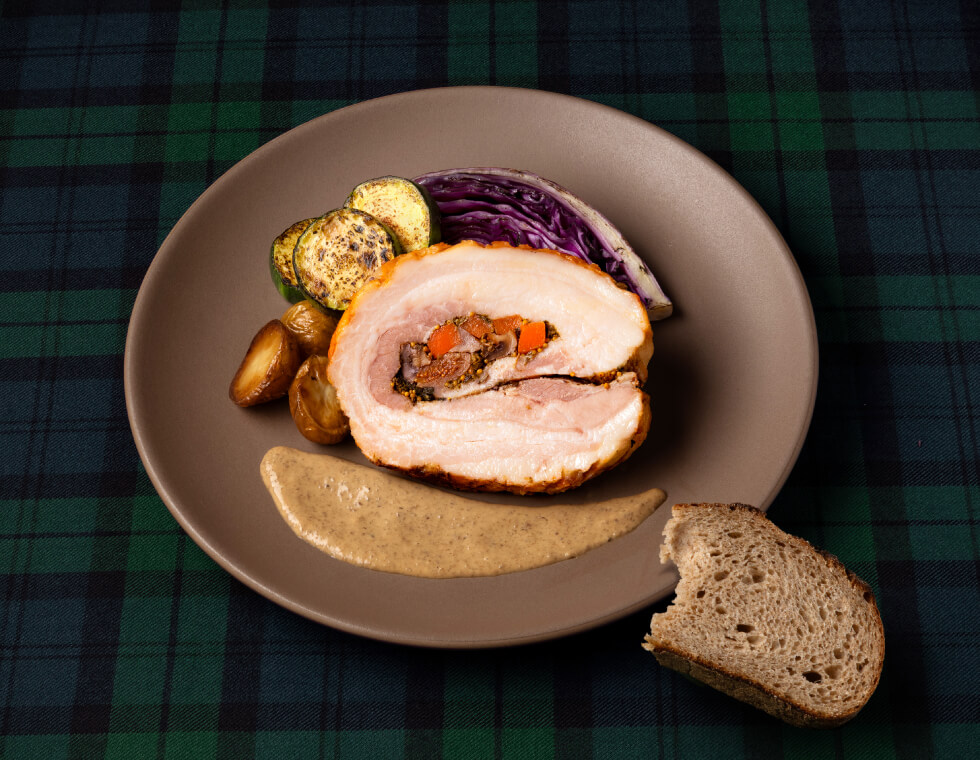 豚バラ肉をハーブ&スパイスが効いたジェノベーゼで味付け。鮮やかな野菜を包みじっくりジューシーに焼き上げました。トリュフ薫るソースをお好みで。<予約限定>