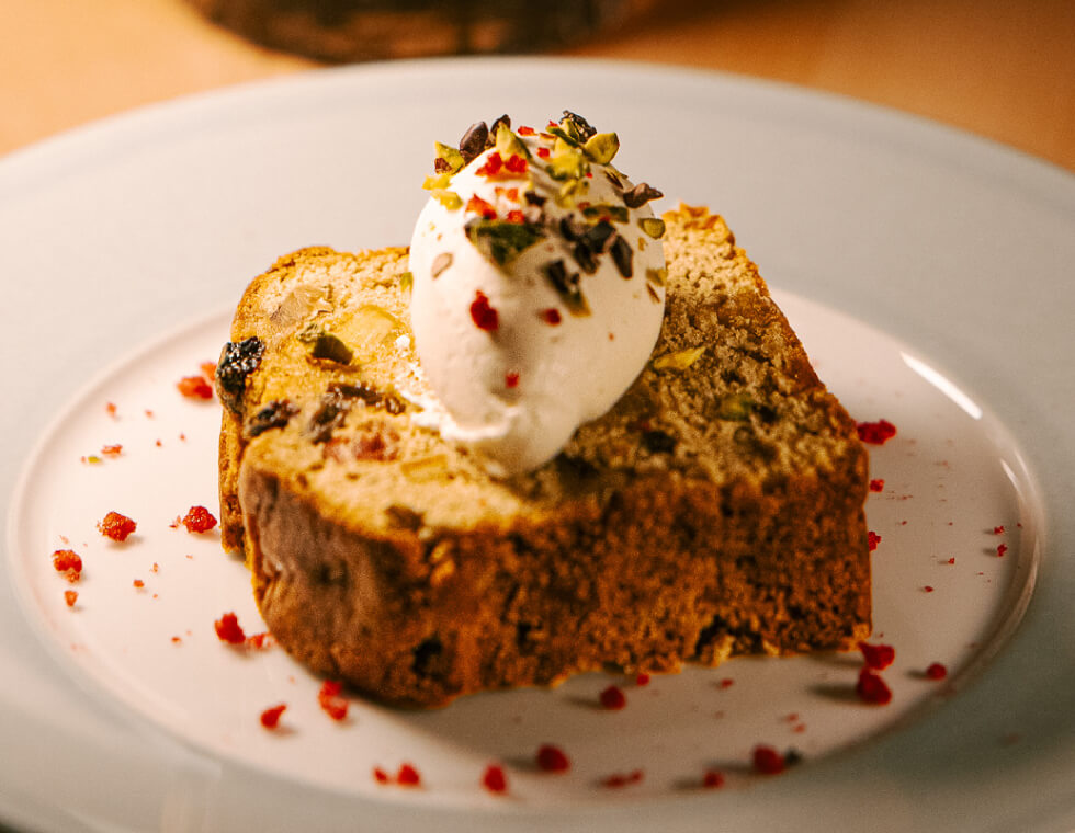 自家製のオレンジとレモンのピール、ラム酒に漬けたドライフルーツ、イチジクや胡桃をたっぷりと使い、丁寧に焼き上げた自家製フルーツケーキに、なめらかなシャンティ・バニーユを添えました。ひと口ごと に香りが広がる、LOOPSだけの“大人のクリスマス”をお楽しみください。