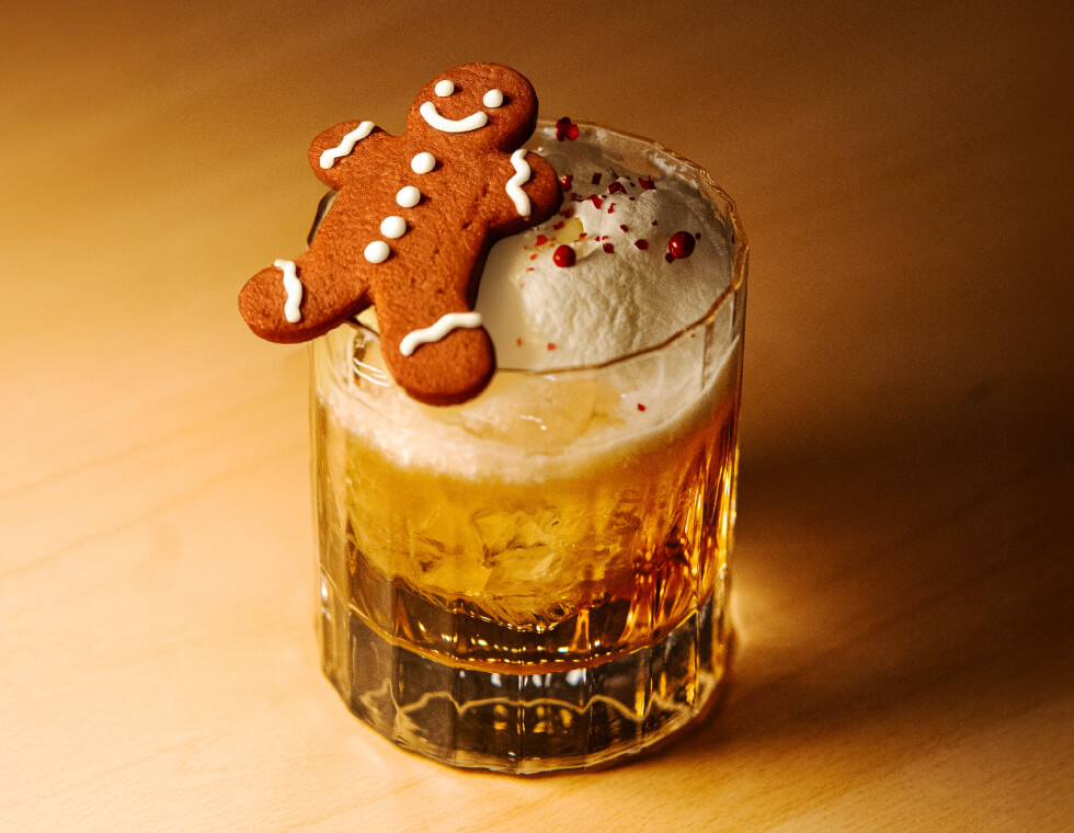 スパイス香る自家製ジンジャーブレッドウォッカをベースに雪に見立てたホワイトチョコを浮かべて。カップに添えられた笑顔のジンジャーブレッドマンで見た目もかわいい、ここでしか出会えないホリデーカクテル。