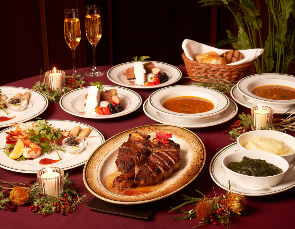 ウルフギャング定番「プライムグレード」に格付けされた牛肉の熟成ステーキに、フレッシュキャビアやロブスターなど新鮮なシーフードを使用した豪華メニューを、NYのクリスマスを彷彿させる格調高い雰囲気の中でお楽しみいただけます。