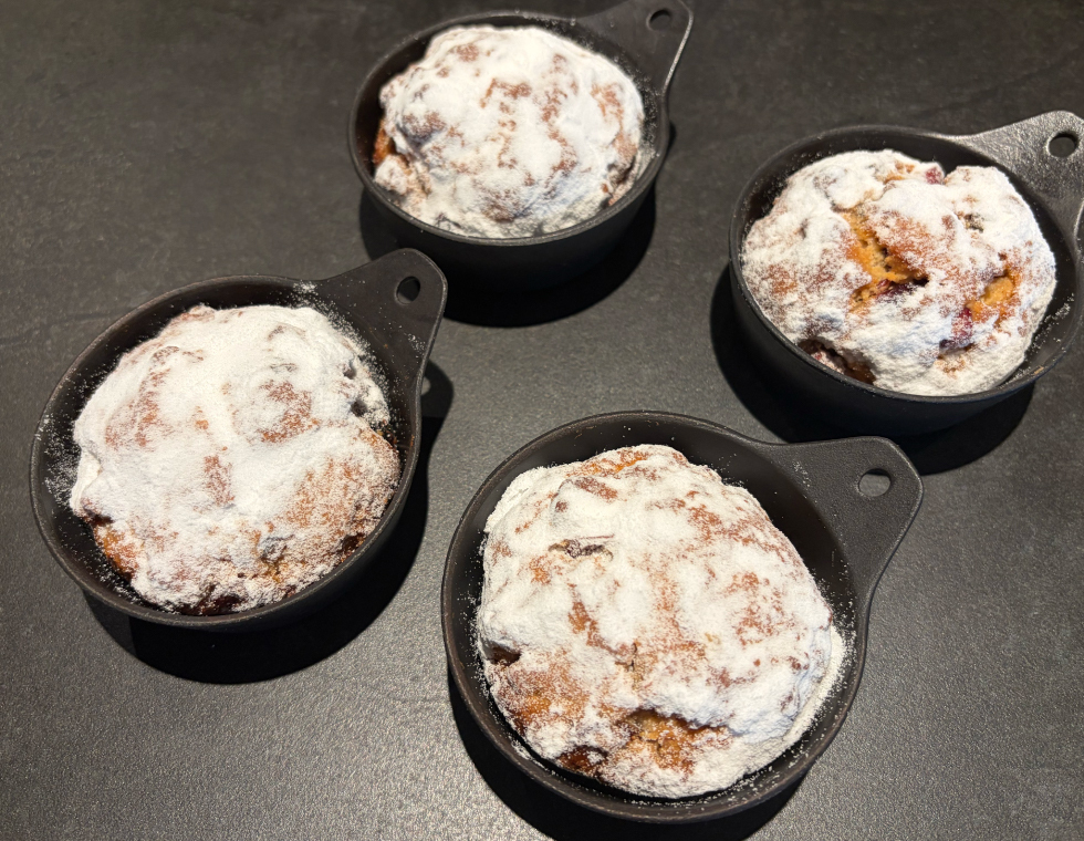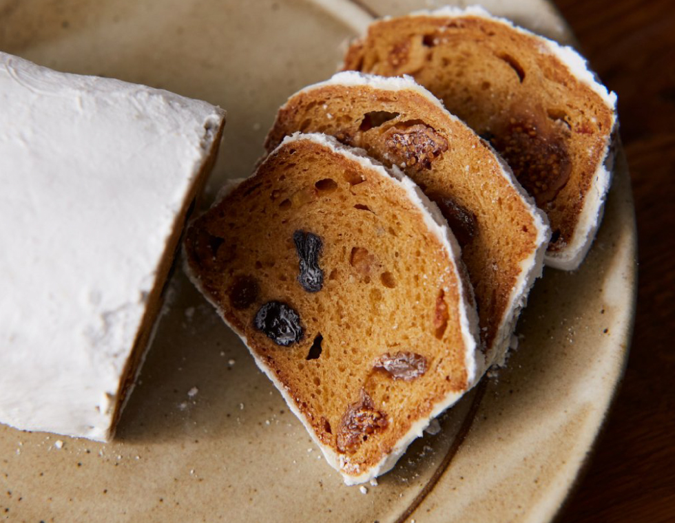 日本酒を使用し、アルコール感よりも日本酒の甘味を生かしたシュトーレンです。バーミキュラのスキレット中はしっとり、外はカリッと焼き上げました。
