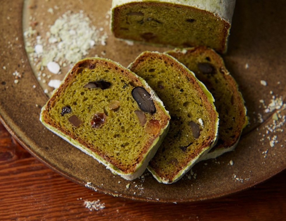 熊本県桜野園の抹茶を使った生地に栗、大納言小豆、丹波黒豆、伊予柑、くるみが入った和のシュトレン。