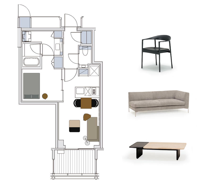 各お部屋には、お住まいの間、くつろぎとつながりを生み出すソファやテーブル、長く愛されてきた名作の家具、